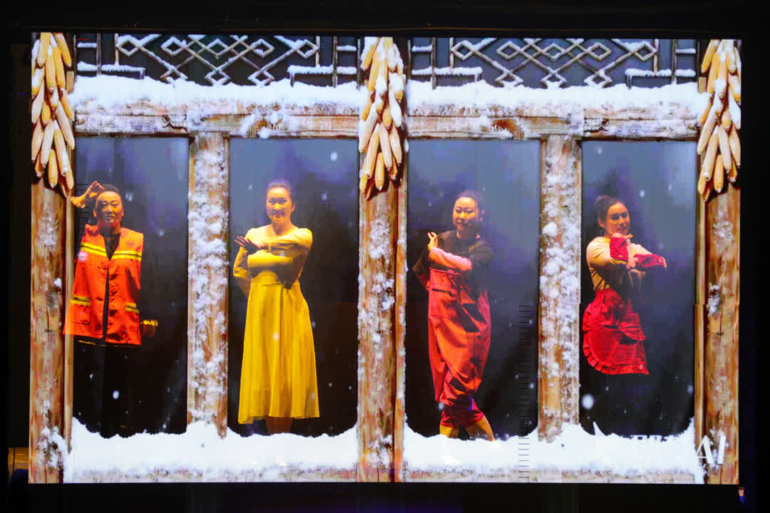 为增强观众参与感,晚会特设“非遗赠福”互动环节,通过抽签方式向幸运观众赠送非遗传承人现场制作的剪纸、刺绣、树皮画等手工艺品,让传统文化可触可感。60秒限时拉票环节更将氛围推向高潮,借助声量分贝仪评选“村晚人气之星”,台下呐喊与掌声交织,热度持续攀升。晚会舞美设计亦匠心独运,采用多层递进式屏幕矩阵,以“全息屏+冰屏+LED屏”的组合打造出富有纵深感的沉浸式视觉空间,为现场观众带来全方位、立体化的视听震撼。