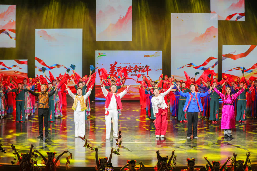 作为2026年度全区“四季村晚”冬季示范展示活动,晚会精心设计四大特色板块,节目形式多样、乡土韵味醇厚。“红红火火大兴安”板块以开场舞《红红火火闹“村晚”》拉开序幕,各族群众盛装欢聚、热闹非凡;拉场戏《争做新村代言人》则以风趣表演展现新时代农牧民的自信风采。